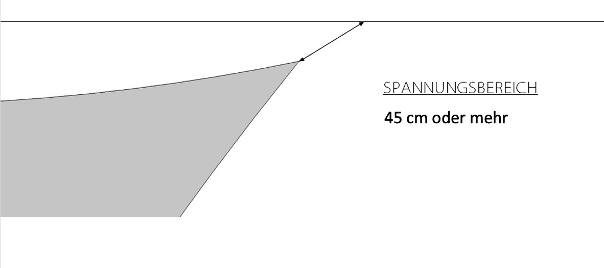 - Berücksichtigen Sie bei allen Segeln der Australe 220 (außer dem Rahsegel 5,00 x 5,00 m) einen Abstand des Spannsystems von 45 cm (ideal) zwischen jedem Segelwinkel und jedem Befestigungspunkt.