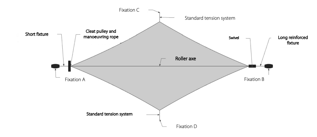- Roller mechanism (swivel, tooth pulley, endless rope, guide ring, elastic, stainless cleat and sandaw).